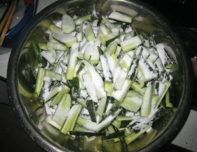 腌过的黄瓜,水分出来很多,一大盆黄瓜条,只剩下半盆了。
