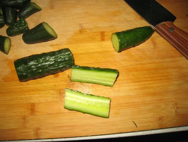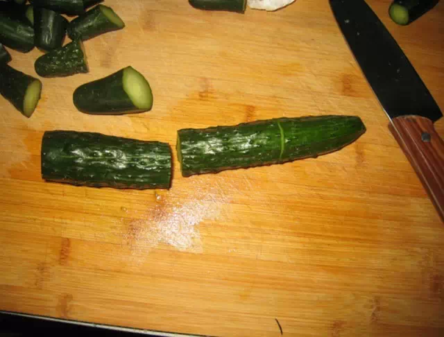 晾干的黄瓜切成段,再把每段切成条。如果还有残余的少许水分,用纸巾擦干