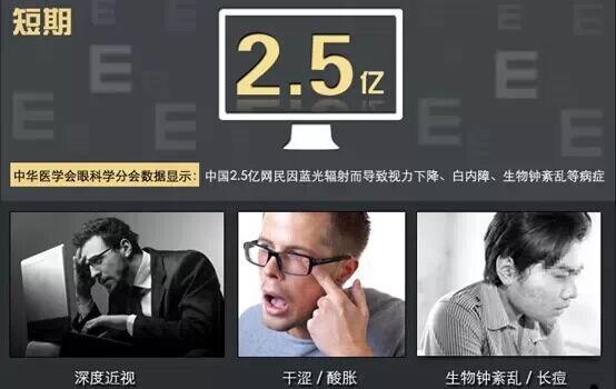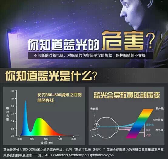 据权威资料统计:国内63.5%的网民因蓝光辐射有视力下降、白内障甚至失明等不同程度地眼疾,电脑的蓝光、辐射正无形中吞噬我们的双眼眼睛是心灵之窗,眼部的任何不适及病变都会给我们的生活和健康带来难以言说的痛苦。可是,在电脑、平板、手机大行其道的当下,在高清HD时代降临的今天,对眼睛的保护成为很多人无法逃避的难题。