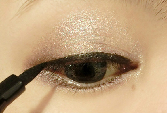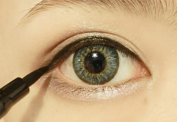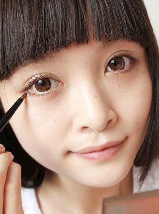 这个妆容用不到眼线的直接用深棕色的眼影当眼线就可以像刷眼线一样涂在眼睛上面就好深棕色也不会太深不会给人化妆的感觉