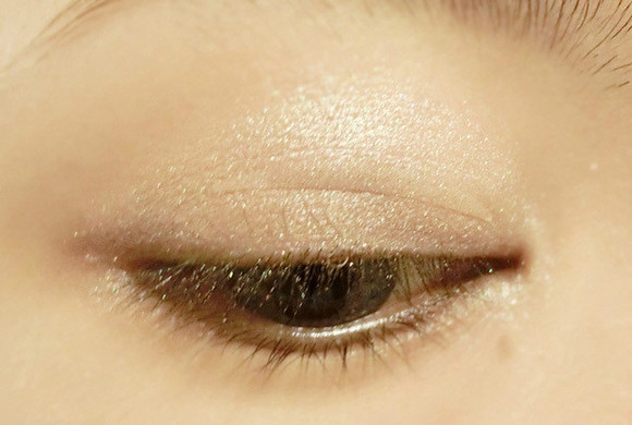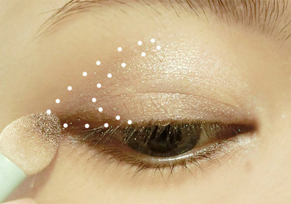 用裸色带光泽眼影涂抹在整个眼部 上眼皮和下眼睑都要 这样可以增加眼部光泽感 让妆容看起来更透明