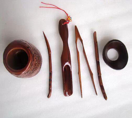 茶道六君子材质通常为竹木的材质,竹制品气质清雅,木制品质感纯然,与茶香墨香相得益彰。其他茶道的配件还包括:茶盘、茶席、茶巾、茶宠、茶垫、养壶笔、茶滤网。