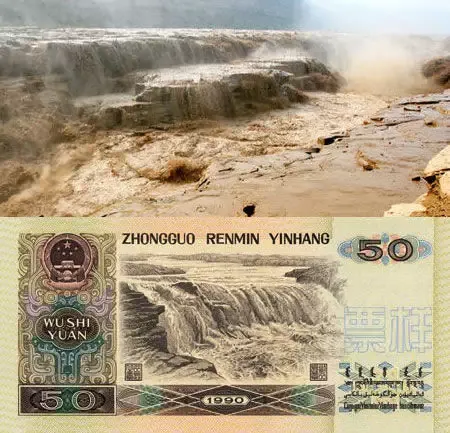 壶口瀑布是黄河流域的一大奇观,它是中国第二大瀑布,这里的壮观风景成为第四套人民币50元的背面图案。由于河水的侵蚀作用,壶口瀑布每年都会向上游移动一小段距离,现在10元钱币上这个场景,几百年后会永远地消失在咆哮的黄河水中。