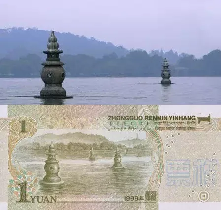 “三潭印月”是我们日常生活中最常见、“接触”最多的风景,因为它出现在第五套人民币面值1元的钱币上。三潭印月是杭州西湖的标志性景观,是江南园林“自然风光与人工建筑结合”的典范。人民币上的图案并非完全写实,摄影师所在角度只能拍到两座石塔。