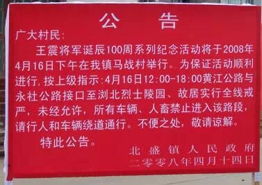 王震将军100周年诞辰纪念活动将于今天下午2点在将军故居浏阳北盛马战村举行. 王震将军为了人民解放事业奉献了终生,是以毛泽东主席为首的早年人民解放事业中最忠实的卓越领导人之一,将军的故乡是中国为数不多的革命老区,故乡人民当年对革命事业的热诚从将军身上集中体现出来.井岗山到天山南北都留下了将军的脚印. 将军永远活在故乡人民的心中! 我们缅怀将军! 秋收起义的旗帜下,倒下了千百万工农子弟,共和国的旗帜是千百万工农子弟染红的. 俗话说"一将成功万骨朽".如果将军活到今天,他会和故乡人民一道欢庆当今的盛世,共享成功的喜悦和胜利果实. 历史上的历史学家曾经这样描叙脱离人民大众的官僚主义:"堂远帘深,君门万里".人民缅怀将军,政府戒严很难让人理解.汗颜啊!呼唤官-民的桥梁!