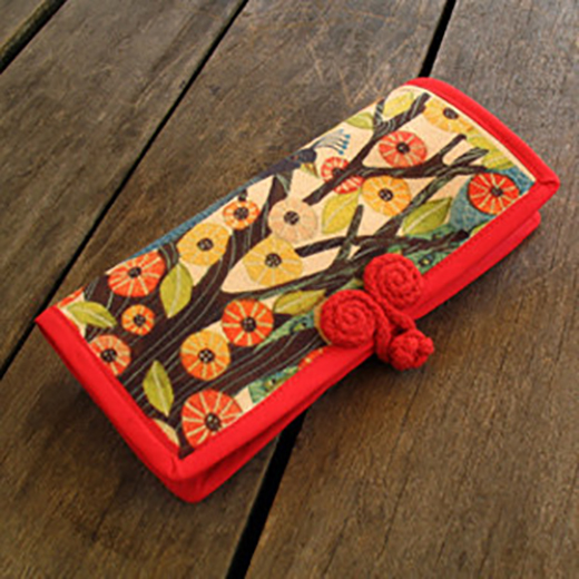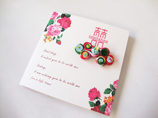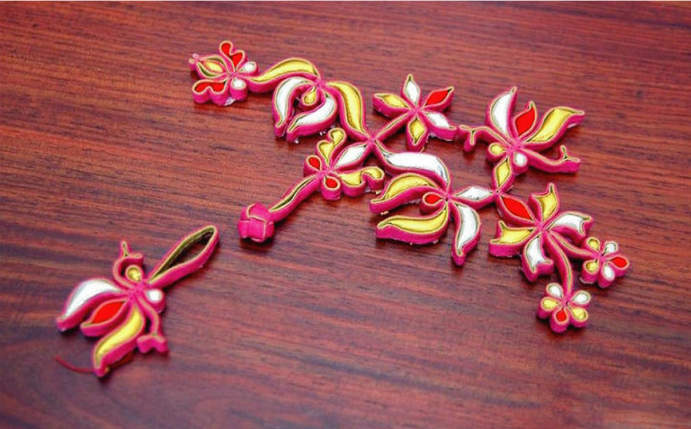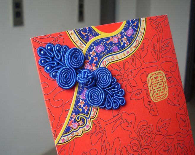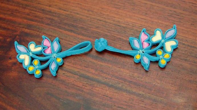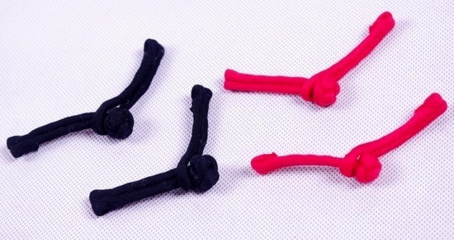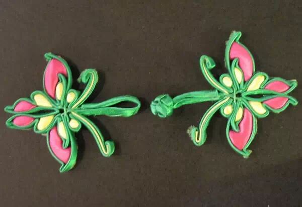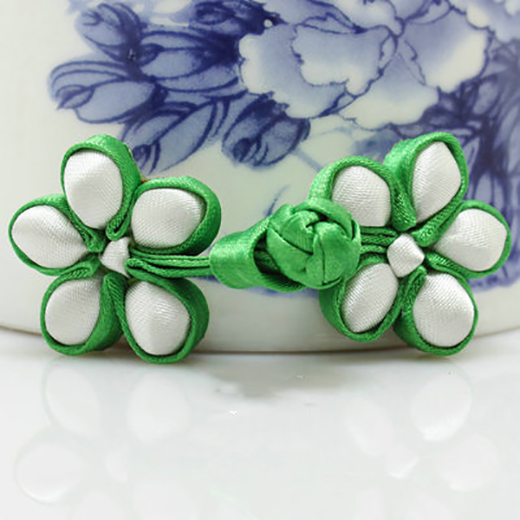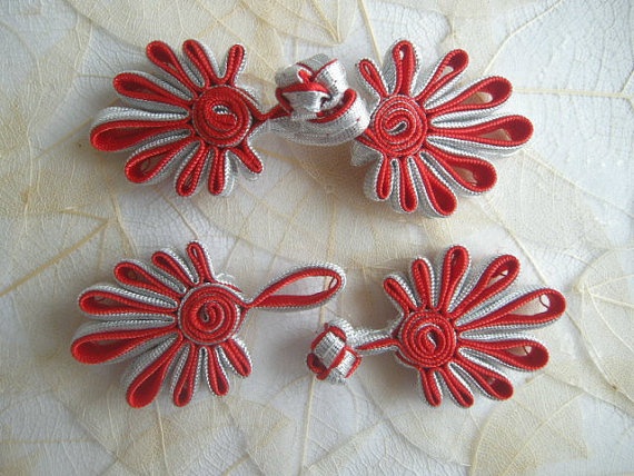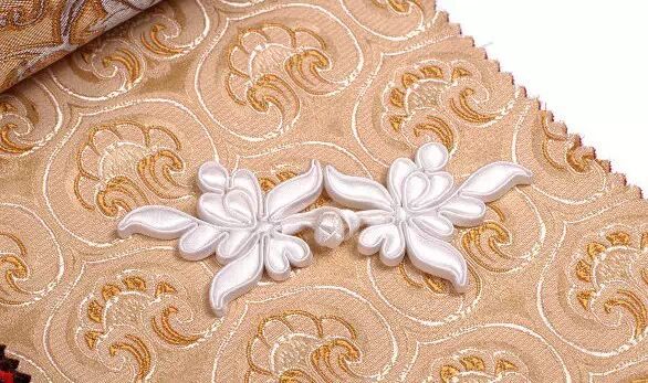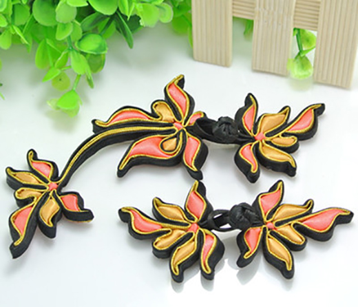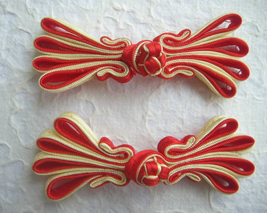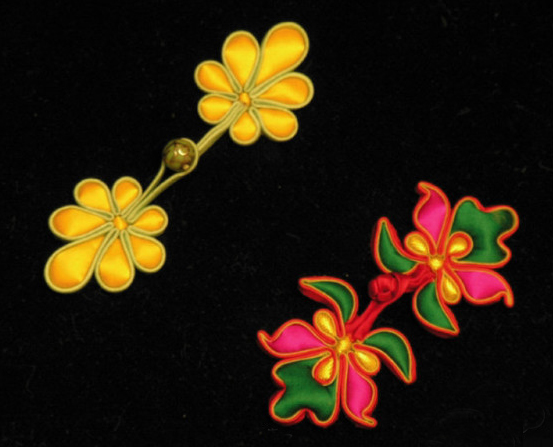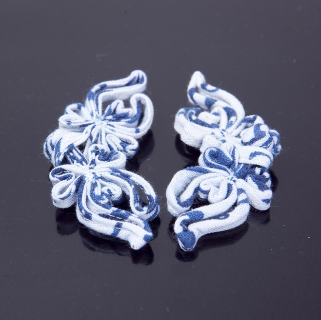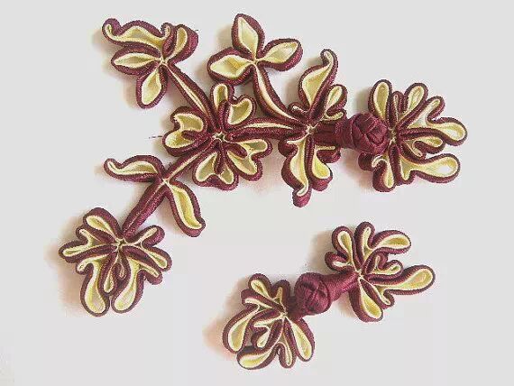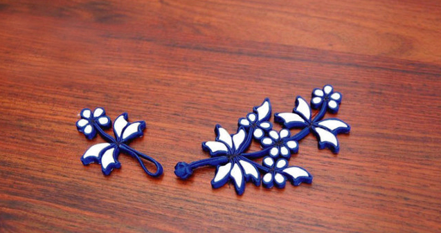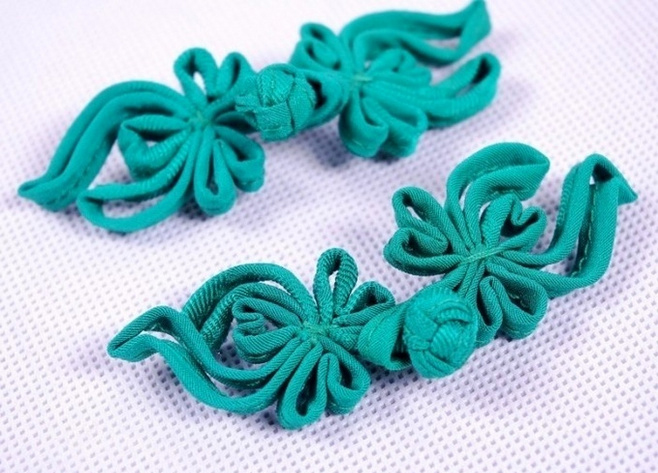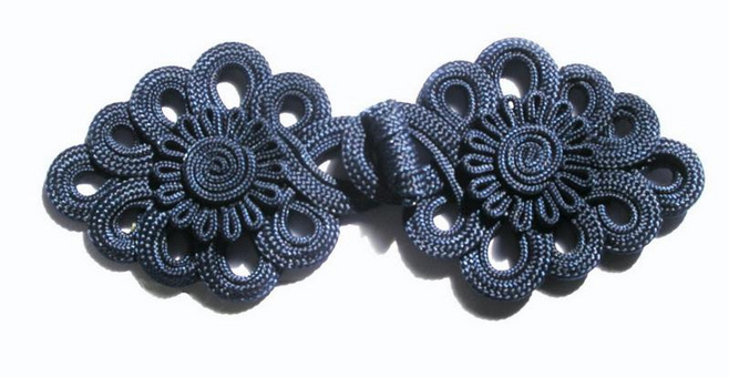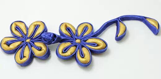 盘扣的花式种类丰富,有模仿动植物的菊花盘扣、梅花扣、金鱼扣、盘结成文字的吉字扣、寿字扣、囍字扣等。也有几何图形的,如一字扣、波形扣、三角形扣等。盘花分裂两边,有对称的,有不对称的。