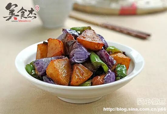 5、放入炸好的土豆块和茄子块翻炒,加入生抽、白糖、盐炒匀入味即可