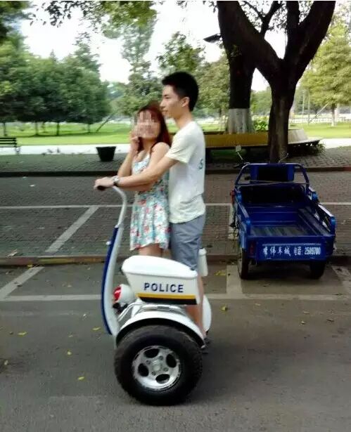 2014年7月29日,网友在论坛上发布了一张警察巡逻队员抱女友骑“风火轮”(自平衡智能电动车)的照片。照片中,1名男子抱着女友一起乘坐自平衡智能电动车,看似十分恩爱甜蜜。