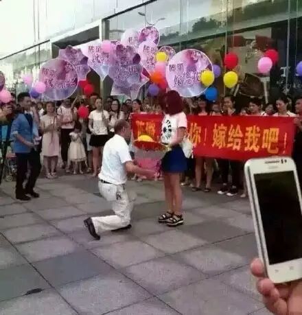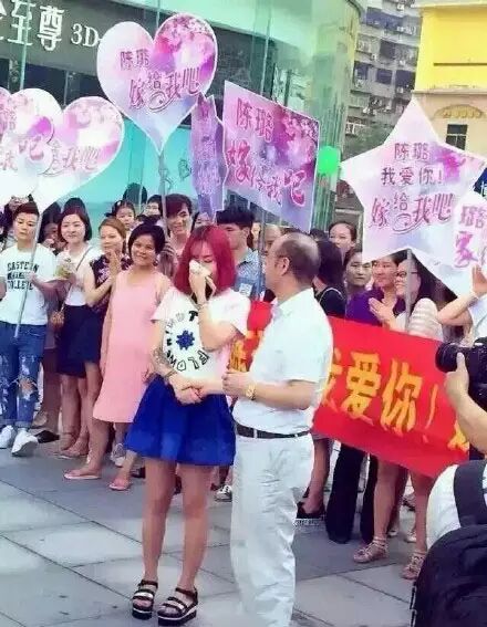 大叔当天怀揣55万钻戒,在湖北黄石武商门口向自己的90“天使”陈璐高调求婚,并大功告成。