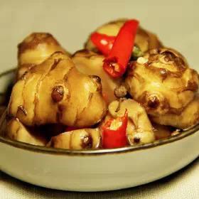 预备泡菜坛子,里外洗净,用干布擦干;把洋姜去皮,洗净,切片,晒成半干,与上述调料拌匀,放入坛中,封好口腌制1个月后即可。