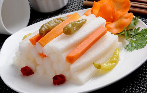 将萝卜削去顶须洗净晾干,然后切成适当的长条,放置室外晾晒至发蔫;将干辣椒、糖、花椒、盐、白酒及白萝卜条拌匀放入坛中,倒入盐水。坛边用水密封保存5天后,即可食用。