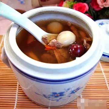 做法:1)把红枣,枸杞,当归,党参和黄芪洗干净2)鹌鹑蛋煮熟3)剥颗洗干净4)取少许瘦肉洗净,切小块5)把所以材料放到炖盅里,加入去了核的红枣6)加两块拍扁的生姜,加半瓶盖的白酒,去腥。电饭锅里加适量水,放入炖盅7)将矿泉水倒满炖盅里,盖上盖,水烧开后把键跳到保温状态,就是小火,炖1.5-2个小时8)煲好后加少盐调味,觉得用矿泉水炖出来的汤特别鲜。