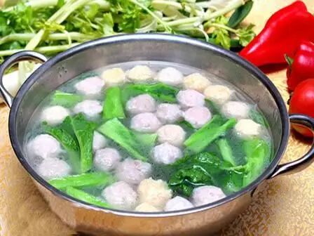 先将肉丸子上笼蒸熟或投入沸水中煮熟亦可。然后在锅中加入清水烧开,放入青菜后再次烧沸时投入肉丸子和其汤汁,并依次加入酱油、白糖、食盐,滚几滚后加入味精出锅。