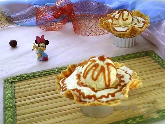甜炼奶120ml,动物性鲜奶油350g,香草荚1/2根,脆皮冰激凌饼干碗2个,奶油焦糖酱