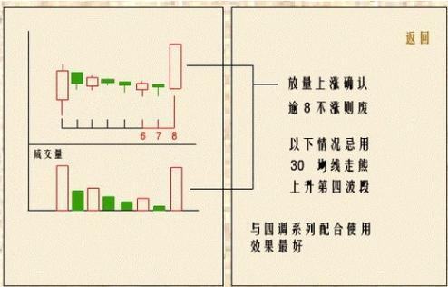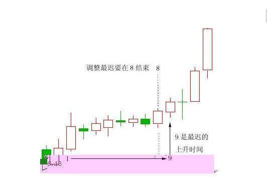 规则1.上升放量介入,否则按兵不动,可将成功率提高到80%以上。趋势阶段中,有可能会产生失败,或者上升力度极其微弱。 对于“单阳不破”而言,最后的上升时间不能拖过第9根K线,若果第9根K线依旧盘整,那么在第11根K线开始引发趋势急速下跌可能性较大,即当涨不涨,不涨则落。可以引申为:在重要的上涨时间内,趋势没有应时上涨,时间一过跌势即将跟来。