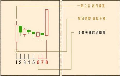 “单阳不破”一旦有效形成,其调整时间不会超过8根K线(如下图所示),通常会运行到第6根K线便进入启动期,行情随时会拉升而起。“单阳不破”会形成最安全的买点,即一根阳线出现,其后7天调整未破其底部,说明市场内在上升力度强劲。即使走势失败,也能顺利出局,风险极小。