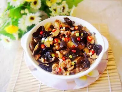 6、香菇、木耳切丝,撒在腌好的鸡肉上,放入蒸锅,水开后蒸15分钟即可。