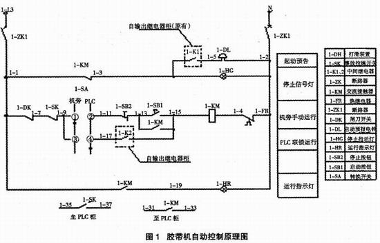 胶带机采用自动(联锁)、手动(单机)两种控制方式,自动、手动方式由自动转换开关进行切换。胶带机装设拉线开关、打滑保护等,这些信号均接入PLC 控制系统。我们注意到,1-SK事故拉绳开关的常开信号直接送入PLC输入模块,由于1事故拉绳开关为220V信号,那么PLC输入模块必须要选择额定电压为220V的输入模块。在实际应用中,事故拉绳开关所产生的冲击电流较大,很容易烧坏输入模块。当我们巧妙利用中间继电器的隔离作用,将强电量的模拟信号通过中间继电器转化为开关量,就能轻易地解决这个问题(控制原理见图2)。