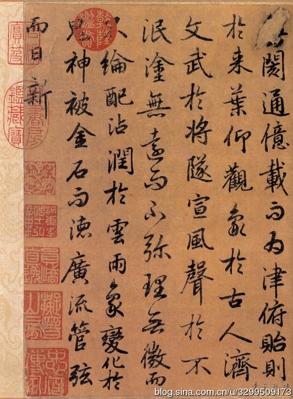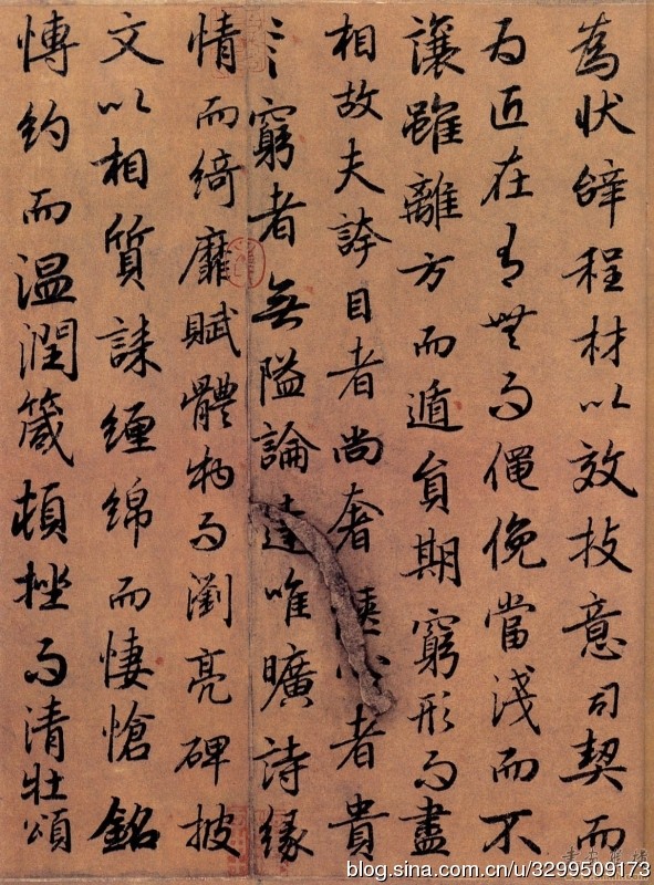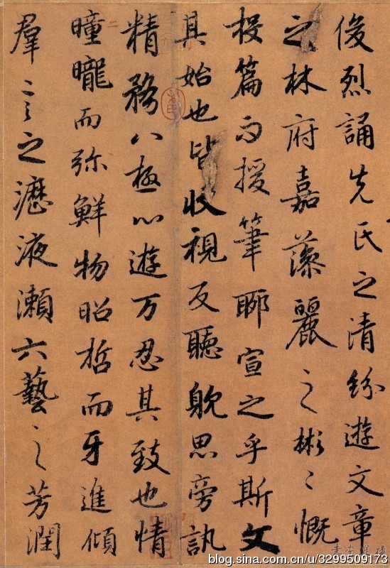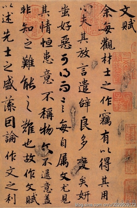 一、字帖 《陆柬之文赋》,全称《唐陆柬之书陆机文赋卷》,无款,纸本。 据《石渠宝笈》记载:纵八寸,横一丈一尺一寸(纵26.6厘米,横370厘米),行书,一百四十四行,一千六百六十八字。 书法婉润清丽,甚似《兰亭序》,赵孟頫书曾得力于此。卷前引首有明代李东阳篆题“二陆文翰”及沈度隶书“陆机文赋陆柬之书”,帖后无余纸,名款已失,有赵孟頫、李倜、揭俣斯、危素、末濂、孙承泽等跋记。帖中“渊”、“世”等字均作缺笔,盖避唐代帝王名讳之故。原迹现存台湾。有影印本行世。 卷后题跋者以赵孟頫为最重要。《文赋》得《兰亭序》真髓,神形皆备,所谓“有晋人风格者”。他于跋中提到的陆柬之另两件作品《兰亭诗》和《兰若碑》,今已不存,所以这件作品作为初唐传至今日的真迹,弥足珍贵,不仅反映了陆柬之的书法水准,即卷后众多题跋中提到的“神俊超诣”、“结体遒劲”,重要的是今日能看到的初唐诸家作品,虽皆以王羲之为取法对象。 《文赋》为晋代陆机撰文,陆柬之书,从中可以窥见深厚的王书风范,为陆柬之行楷代表作。