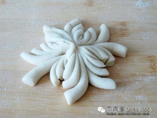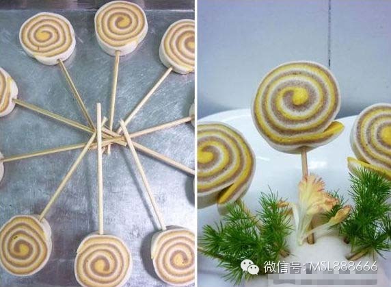 2、切开插入竹棒,醒发一会,入蒸笼蒸熟,就成了棒棒糖状的花卷了。