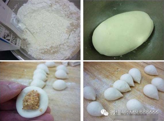 1、所有原料放在一起揉成面团。醒发半小时,搓条下成小剂子,包入花生馅,搓成象刺猬一头尖的形状。