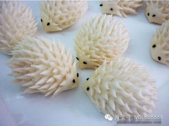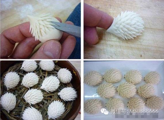 2、用小剪刀剪出一根根的小刺,用黑芝麻做眼睛。醒发一会,放入蒸箱蒸熟。