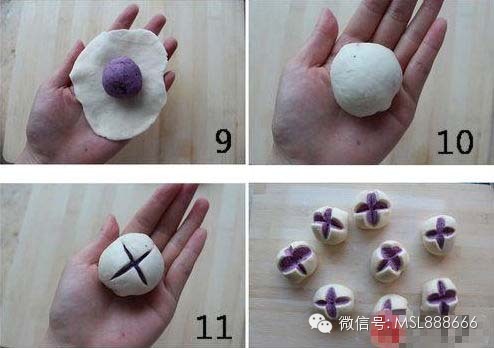 9、取一白面团擀成圆形,放入揉圆的紫薯面团