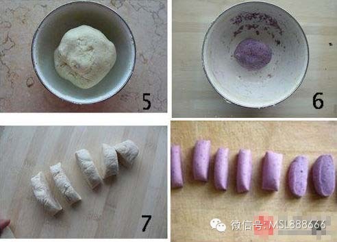 6、取三分之一的白面团加紫薯泥揉成紫薯面团