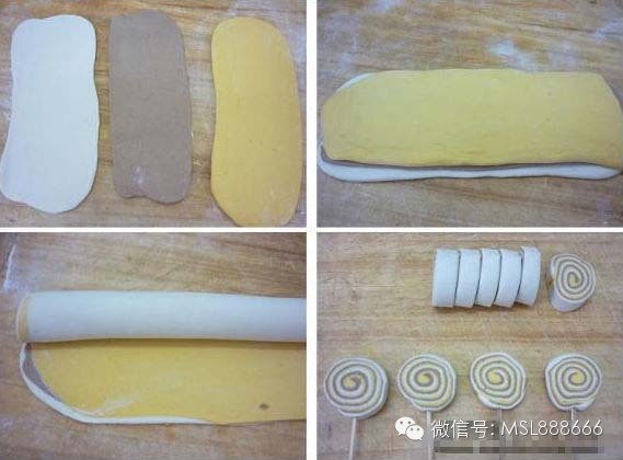 1、面粉分三份和胡萝卜泥,豆沙,水和成三色面团,醒发半小时,分别擀开成大小差不多的薄饼,叠加在一起,从一边卷起成筒状。