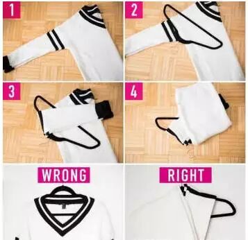 你挂毛衣的方式和挂衬衫是一样的么?那就大错特错了。毛衣这种自重比较大的衣物需要如下图所示这么挂才可以避免变形的厄运哦!