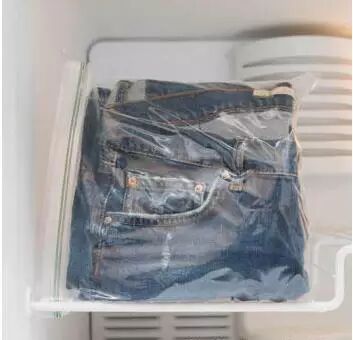 众所周知牛仔裤可不能老洗,因为多次洗涤会让牛仔裤燃料褪色并影响裤型。那么用如图所示这种冷冻的方式清洁牛仔裤吧,冷冻会杀死大多数细菌,冻淡气味,并保持完好的颜色。