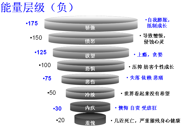 美国著名的精神科医师大卫·霍金斯(Dr. David R.Hawkins)的“能量级别论”研究告诉我们,善的能量级别高,恶的能量级别就低。如下表:
