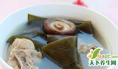 制法:海带用温水泡发、洗净,切成菱形;猪排骨切块用沸水氽一下,温水洗净,加水用旺火煮沸,去浮沫后倒入海带,用小火炖烂,加盐、麻油调味。