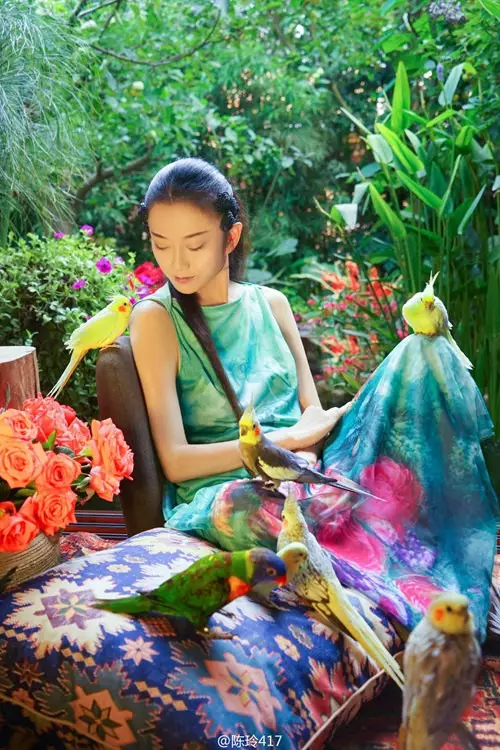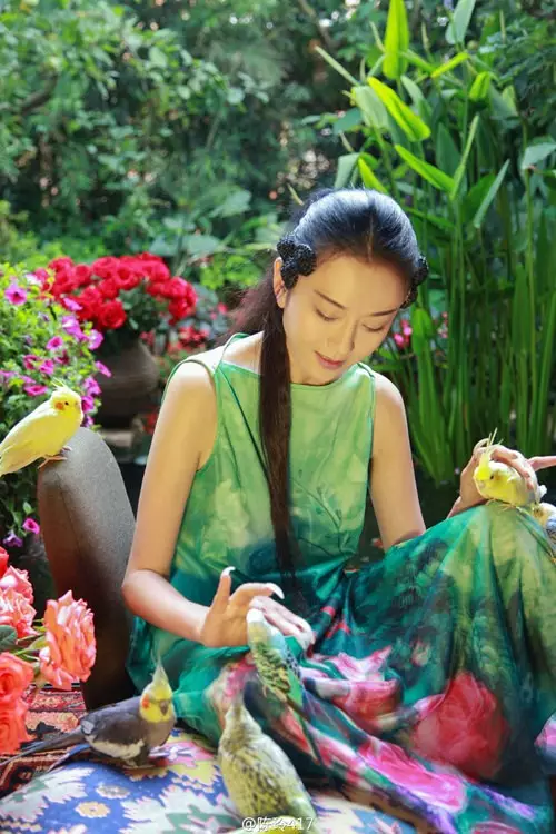 一组杨丽萍在自家花园看书的照片,百鸟围朝,花团锦簇,宛若仙子。