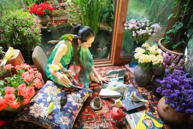 “这是杨老师家中日常看书之地…那些鸟儿都喜欢飞着围着她,名副其实的:雀之灵!看一眼已经醉了!”花鸟环绕万物生长,超凡脱俗真正灵气。