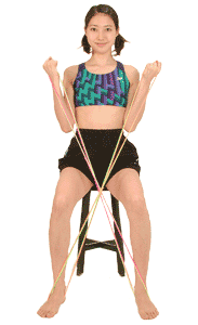 准备好两副橡皮圈。两腿打开与肩同宽。接着两脚各踩住一副橡皮圈的一端,再将橡皮圈左右交叉,两手分别握紧两副橡皮圈的另一端。保持下半身不动,左右扭转上半身。注意挺直腰杆,身体不能前倾。20次为一组,重复3—4组。