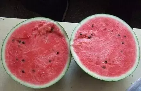 瓜皮上的黄绿条纹不均匀,切开后瓜瓤特别鲜艳,但瓜子却是白色起来没有甜味。