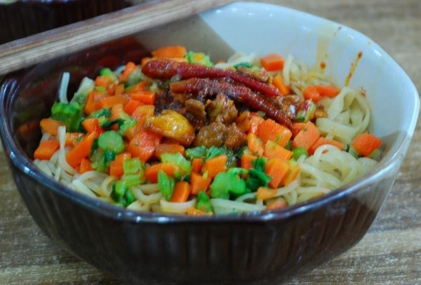 4、将干辣椒炸香制成椒油,倒入牛肉碗中即成。