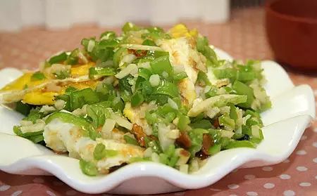 4)将煎蛋、青椒、朝天椒倒入翻炒,加适量的盐、糖。出锅前淋生抽,再翻炒一分钟即可。