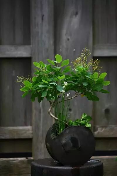 因而可以在“水盘”(suiban,一种阔而浅的花器)的更为广大的范围内排列剪枝。这种方法使得与传统造型不相容的其他新的材料得以使用,同样也促成了景观造型(shakei)的出现。景观造型是以一种自然主义的方式,而不是象征的手法描述了自然美。此段时期,另一位采用了“盛花”造型的重要的改革者是阿立曙(1887-1969),他将他的造型描述为仅仅具有 “装饰性”。
