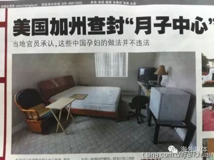 三月三日清晨,美国联邦移民局,连同国税局,采取行动,突击搜查大洛杉矶地区多个城市的中国产妇“月子中心”,和招揽中国产妇来美产子的中介机构,共五十多家。当天,美联社、华尔街日报等各大报纸的网站、赫芬顿邮报等网络媒体、各大电视网,都迅速报导了联邦执法人员的这一突击行动,于是那一天美国人都知道:中国人在美国制造了“二奶村”、“贪官城”奇异人文景观之后,又制造了一个新的奇异景观“月子中心”。