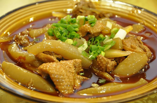 配料:生姜、大蒜、葱、八角、桂皮、花椒、干辣椒、老抽、冰糖、鸡精、料酒各适量。