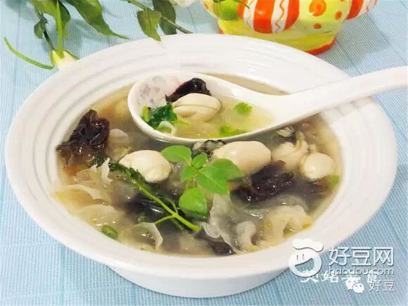 牡蛎250g,木耳80g,银耳70g,香油,盐,葱,姜3片,胡椒粉,料酒,醋,香菜,鸡汤