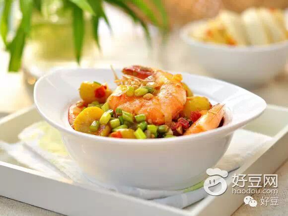 鲜虾500g,板栗200g,洋葱1/2个,蒜薹200g,姜1块,盐1茶匙,蚝油1汤匙,鸡精1/2茶匙,豆豉酱50g