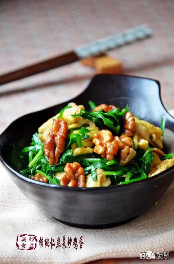 韭菜100g,核桃仁50g,鸡蛋2个,橄榄油,盐,白糖1g,香油