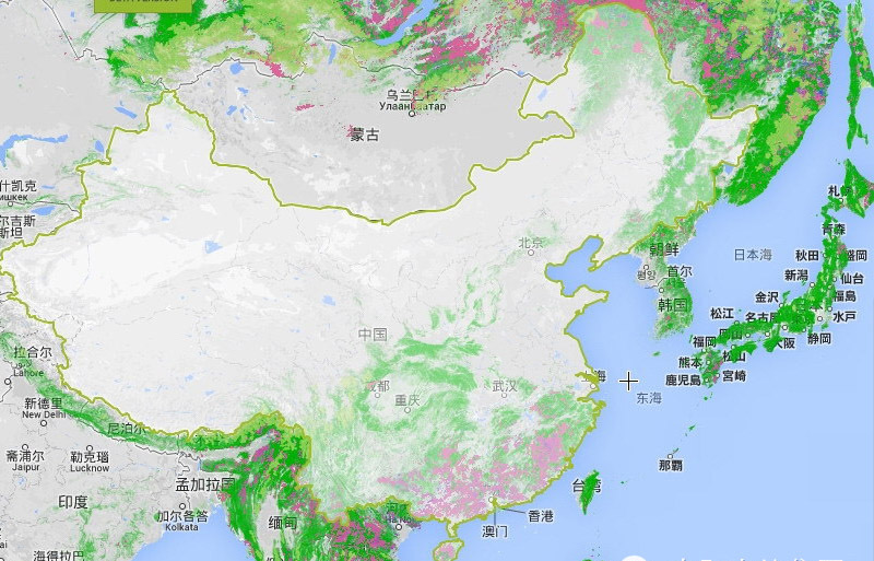 最深的绿色表示覆盖率在75%-100%,次深的绿色是50-75%,浅绿是25-50%(如下图示)。灰色的表示覆盖率低于25%。粉色的部分,表示树木正在减少。