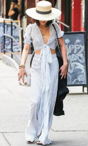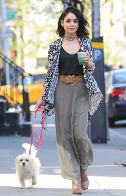 凡妮莎·哈金斯(Vanessa Hudgens)短款上衣+阔脚裤,大沿草帽,平底鞋,这时尚范让人不注意都难!