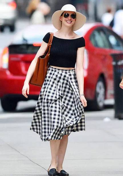 安妮·海瑟薇(Anne Hathaway)穿的是黑色一字肩短上衣+格子长裙。