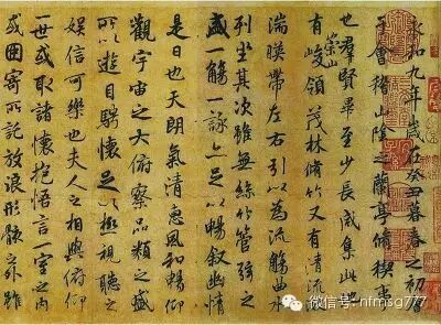 清十全乾隆帝,在内府收藏的八卷兰亭中择取精华,分列排序。此次展出的褚遂良本兰亭序排名第二,与名列第一本虞世南本兰亭序笔迹相似。以当今学者研究之所见,这两本兰亭未必出自所谓名家之手,但字体布局间所见笔迹构成,足具当时风神。而根据现代科学理化的分析,虞世南本兰亭序所用为白麻纸,为唐朝遗物;而褚遂良本兰亭序采用楮皮纸,却常见于北宋时期。这种时代所具的差别,或许已被清人洞悉。