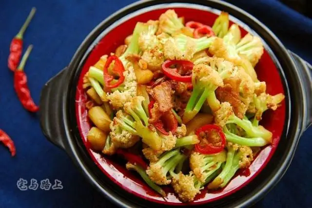 4、开大火,倒入菜花,略停30秒再翻炒几下,盖上锅盖,调中火焗30秒,这时候可以看出菜花头都有点焦色了